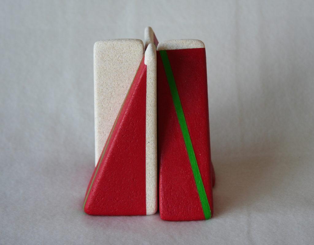 Wt 2 lbs, 12.6 oz, Ht 5 1/2” W 4” L 5. Oamaru stone (NewZealand Limestone), steel dowels and acrylic paint.