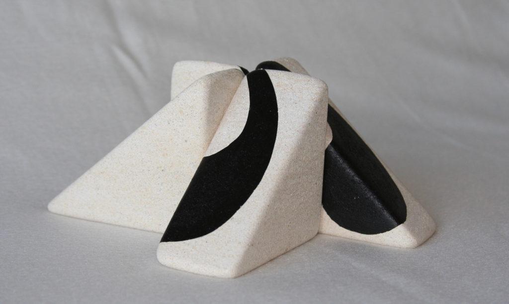 Weight: 3 lbs, 7.7 oz, H 3 1/2” L/W 5” and diagonal on the bottom is 8 1/2” Oamaru Stone (New Zealand limestone), steel dowels and acrylic paint.