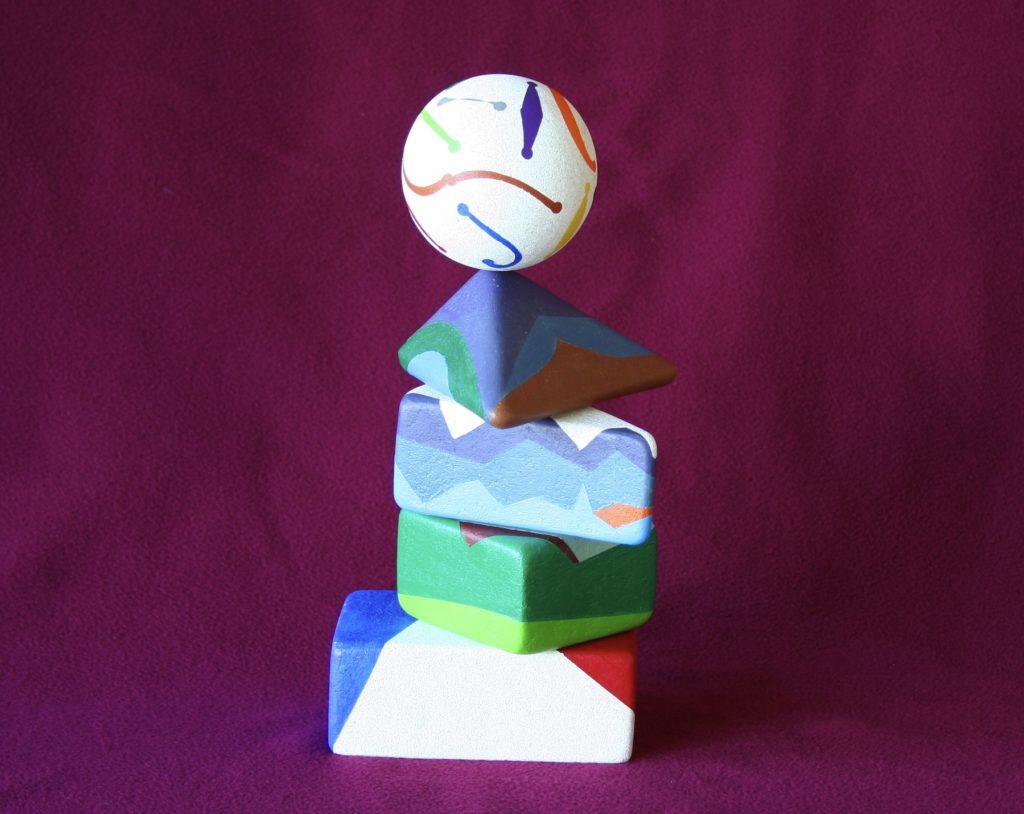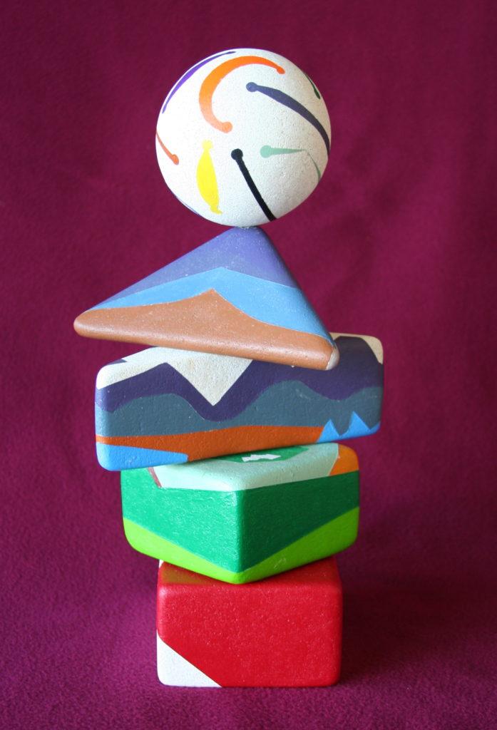 This is for my daughter Erin to celebrate her 50th birthday. She has amazed me during these 50 years, gathering friends from all over the world, traveling extensively and living in France, Norway, and New Zealand for long periods of time. The base represents the colors within the flag of every country she has resided and also the Serbian flag of her heritage. The base also represents France, the friends the regions special for her. The next is my representation of New Zealand. The green of the paddocks and then the forests and the white is the southern alps, the browns represent the other agriculture. The triangle is Norway with its rugged coast and fiords and mountainous terrain that rises from the coast and the white on the top is the winter snow. The small golden patch is the lower area around Oslo. Next is Nevada and its famous Pyramid Lake represented by the pyramid shape. One one side is Lake Tahoe with the blue, the forests, and then the purple of the surrounding mountains looking at Mt. Talac. The other sides represent the high desert and the Basin and range that are so prevalent in the state. The top sphere is representative of Erin’s dances, the places she has traveled and the people/friends she has collected during her life to 50!