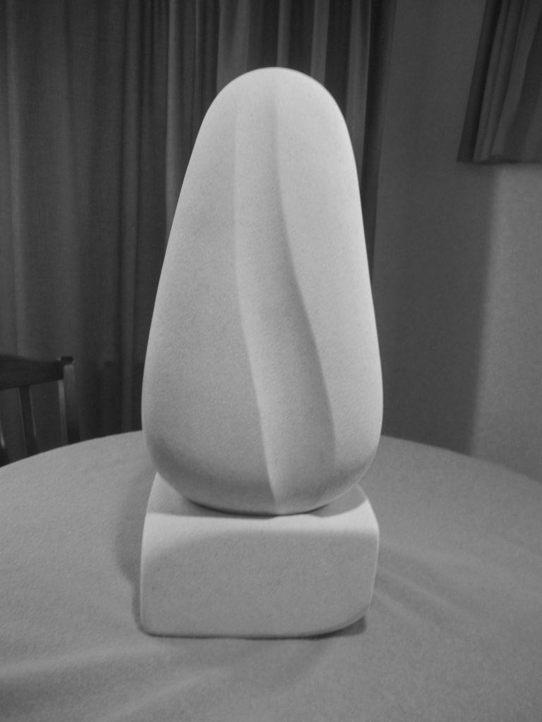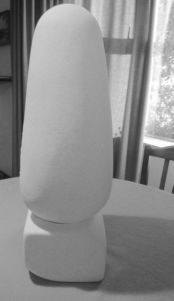A rectangular block base fashioned toward a square top and then finished to this shape. There is a groove side and a distressed “cracked” side (a variation of the Yin-Yang). This could be out of doors or inside. Out of door pieces need to have a clear silicone coating to reduce acid rain damage or mildew/moss growth.