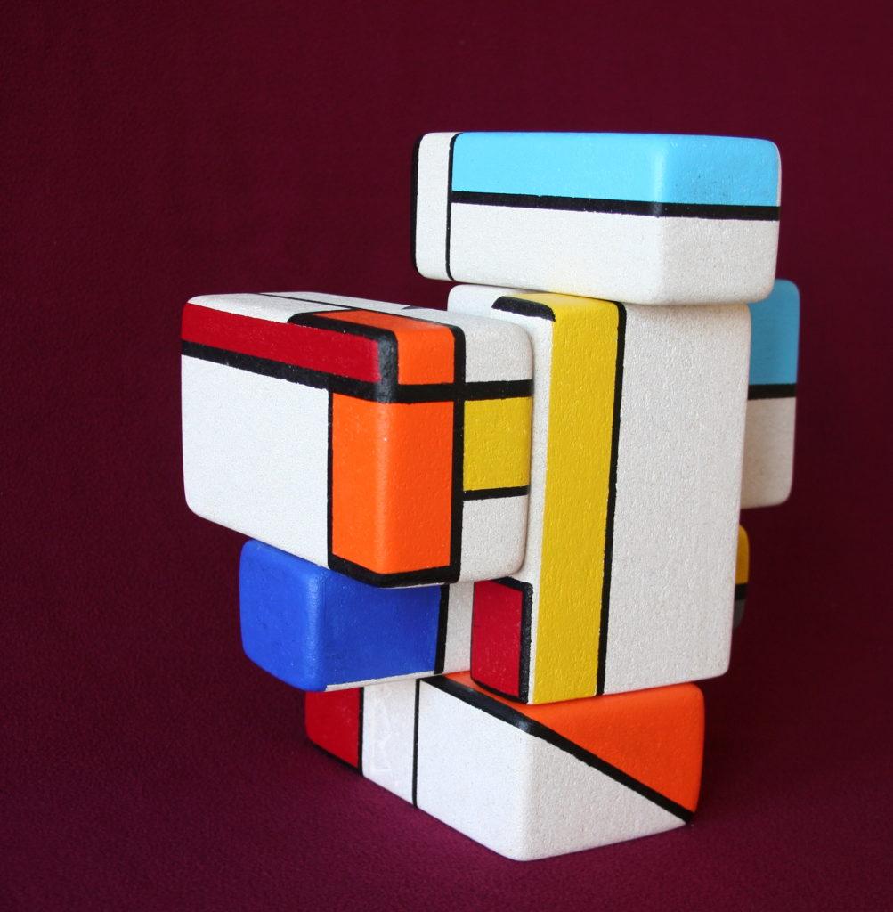 I always admired the simplicity of Mondrian’s geometric period with his colors and black lines. This piece was a complicated construction. The block’s positions had to have a style I thought would emulate Mondrian. Blocks were painted in a predetermined pattern to make it fit my interpretation of Mondrian. This piece is 28.2 pounds and 13”x13”x8” (greatest dimension). The sculpture is Oamaru stone (New Zealand limestone), threaded steel dowels, masonry glue and acrylic paint.