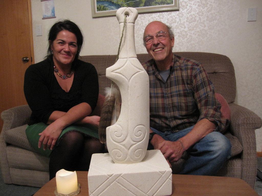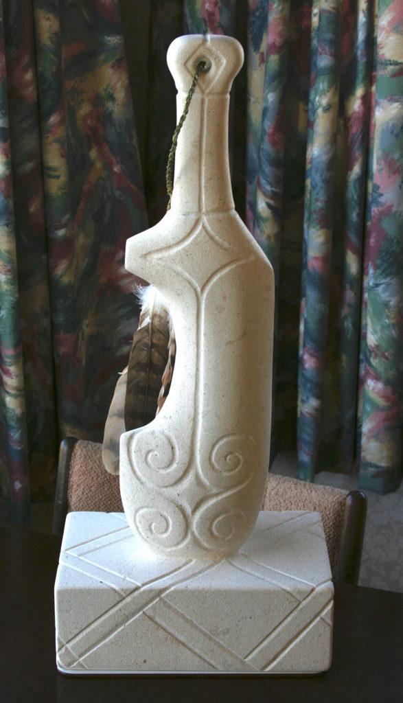 There are many styles of the Maori war hand weapons. This sculpture represents a patu (with a style of the Wahaiki). I incorporated a Maori design on the face and a distressed support on the back side. The “wrist holder” was of braided native flax and the attached feathers were from a harrier hawk killed by a car. The base has a Maori basket style weave.