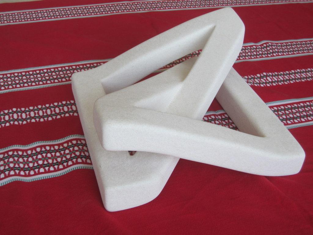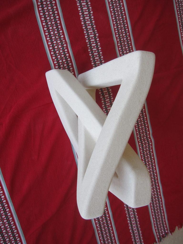This piece has a single connection between the two triangles where the two long arms cross. Because of the interlocking, the challenge was to preserve the single connection during the carving and also to maneuver around the “cross overs” to carve and finish this piece.