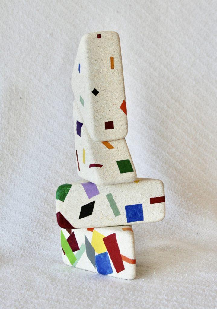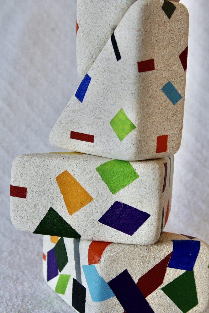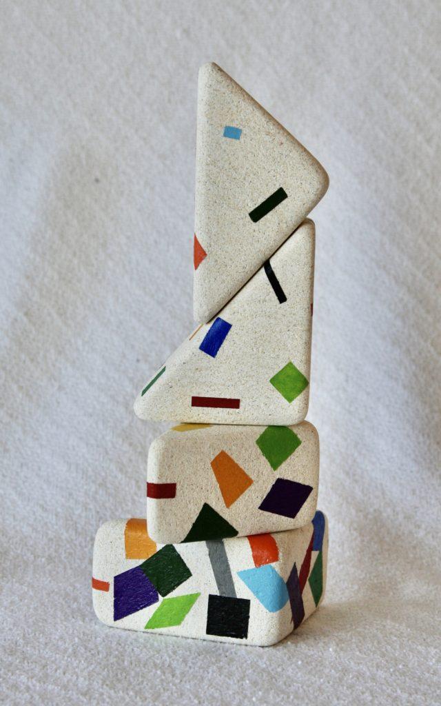 This sculpture is a whimsical representation of multiple colors within four sided shapes cascading from small and few to large and many from top to bottom. I just had his idea I wanted to try and needed to use a new technique to apply the acrylic paint to each of the objects. The blocks were glued with steel dowels.