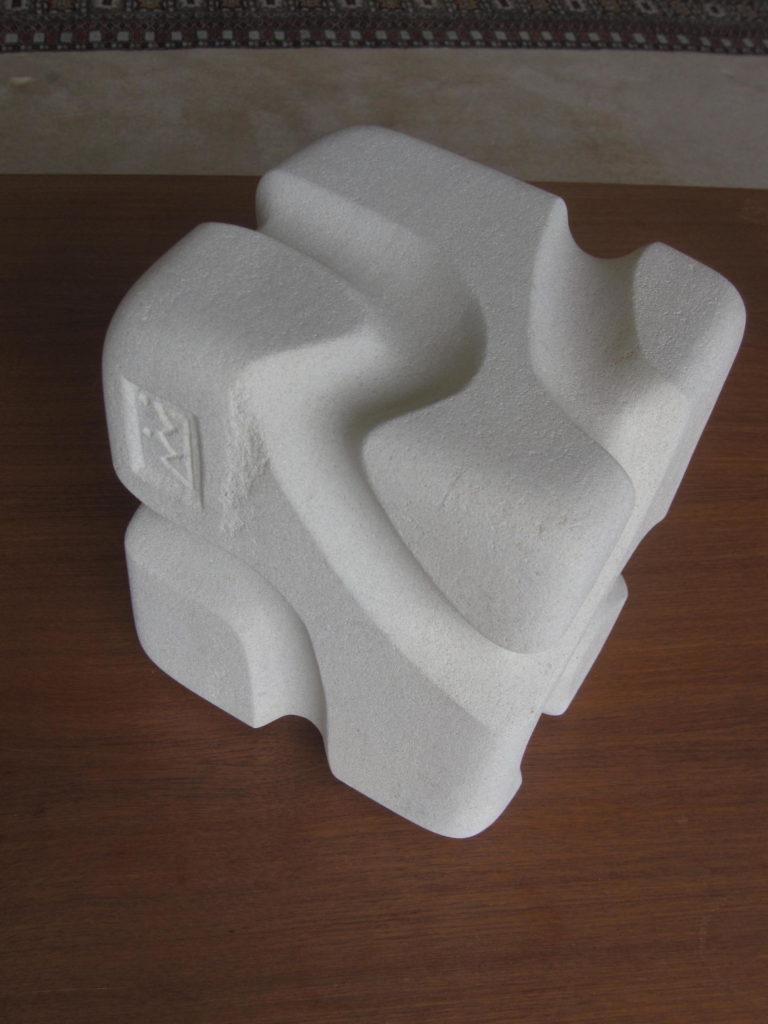 My sculptures of Oamaru stone (New Zealand limestone) evolved into a “4th dimension” style as a challenge to myself. This initial challenge resulted in a rectangular cube (could have easily been a square) with a line running through some part of each edge (12 edges) without intersecting itself (Sculpture #11).