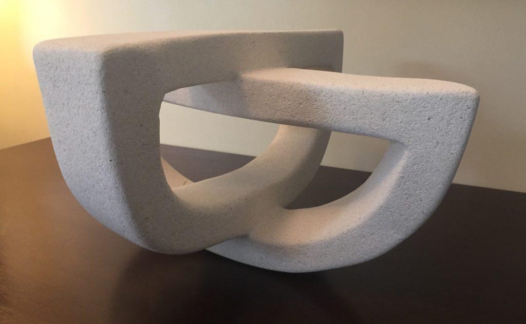 Half-Circles #14 The sculpture was made from one half of a pillar with the curves representing that configuration. This interlocking half-circle piece of stone was less compact (hard) and a nice smooth surface was not possible. #13 – Celtic Embrace #15 – Maori Block