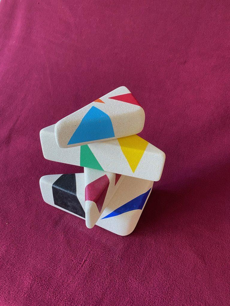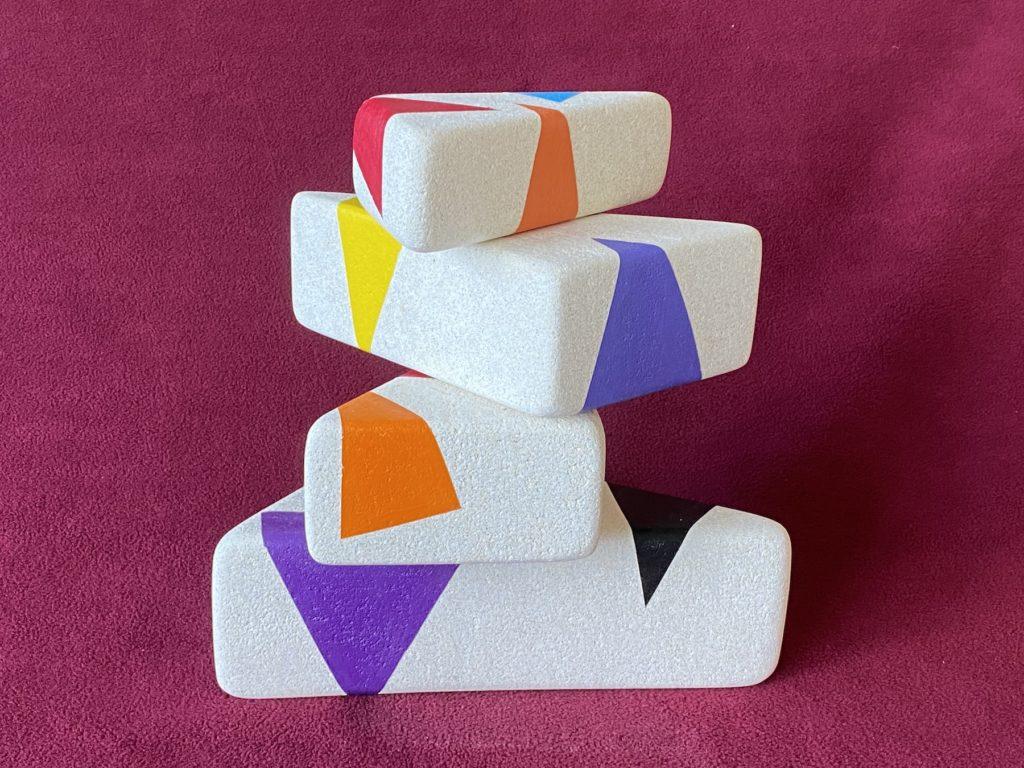 Having pieces of stone from previous carvings inspires me to use these pieces to create a totally different form. This is a design I made for Jesse Bryant and Martin Roussel, good friends from Vancouver BC who have been supportive of the art and have opened their home and hospitality to Margaret and myself when staying in Vancouver. This sculpture is composed of 4 triangles with three different colors painted on each piece. Combining, they representing a “rainbow.”