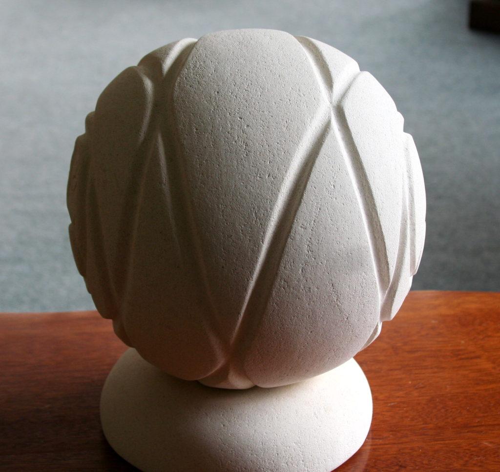 Sphere with Four Spirals #8 – March 2015 Using a cube of equal size sides and a template of the circle for those sides the stone was blocked for the cuts and then shaped into the sphere. The spirals were then laid out onto the surface and grooved. #7 Kaleidoscope #9 – Interlocking Ovals